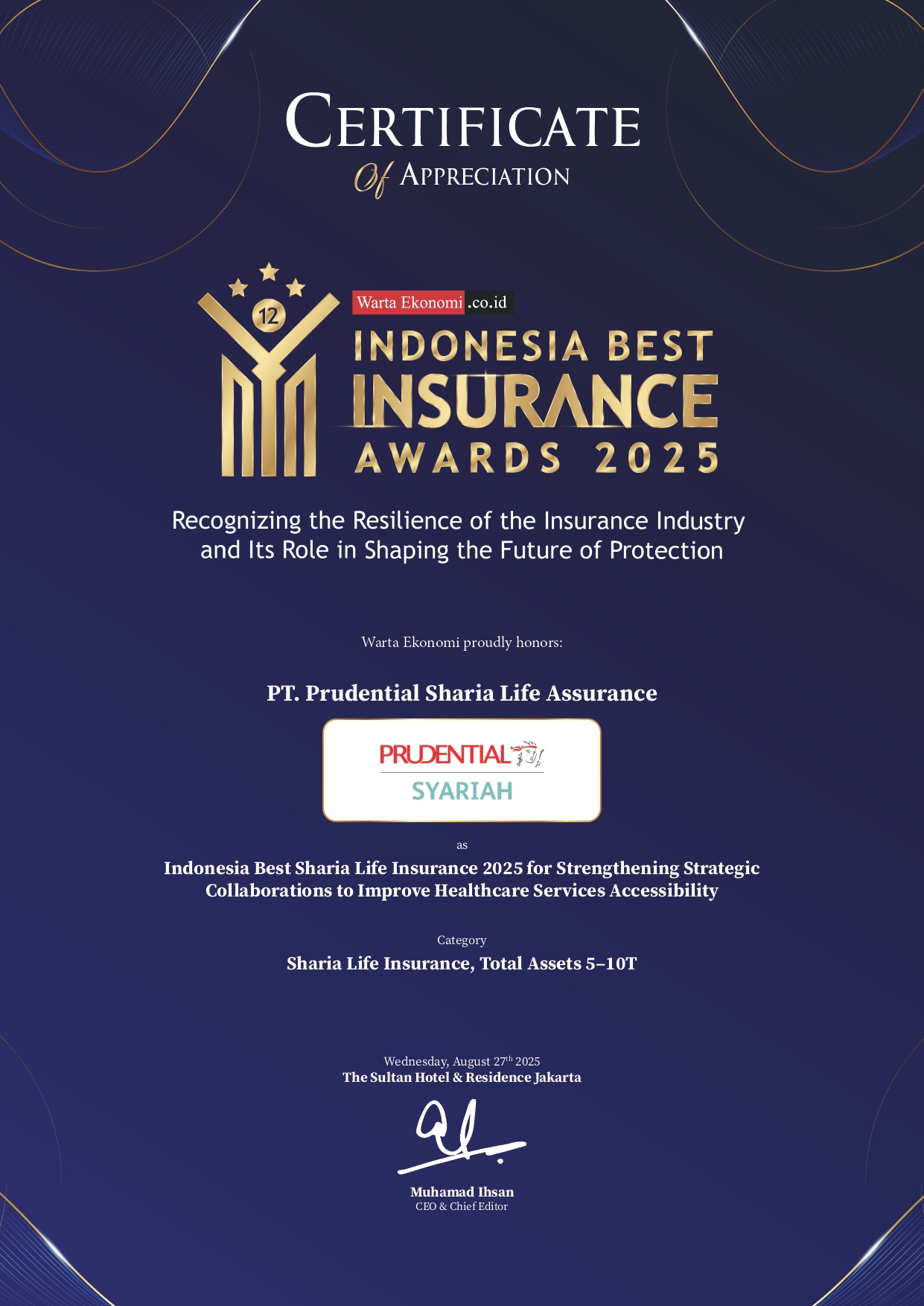 Jakarta, 28 Agustus 2025 – PT Prudential Sharia Life Assurance (Prudential Syariah) kembali meraih penghargaan bergengsi “Indonesia Best Sharia Life Insurance 2025 for Strengthening Strategic Collaborations to Improve Healthcare Services Accessibility”, berkat peran aktifnya dalam memperkuat kolaborasi strategis guna meningkatkan akses layanan kesehatan di dalam maupun di luar Indonesia. Penghargaan ini diberikan atas komitmen Prudential Syariah dalam menghadirkan solusi proteksi kesehatan syariah melalui inovasi produk serta kolaborasi dengan berbagai mitra, guna memperluas akses layanan kesehatan di tengah tantangan industri asuransi yang terus berkembang.