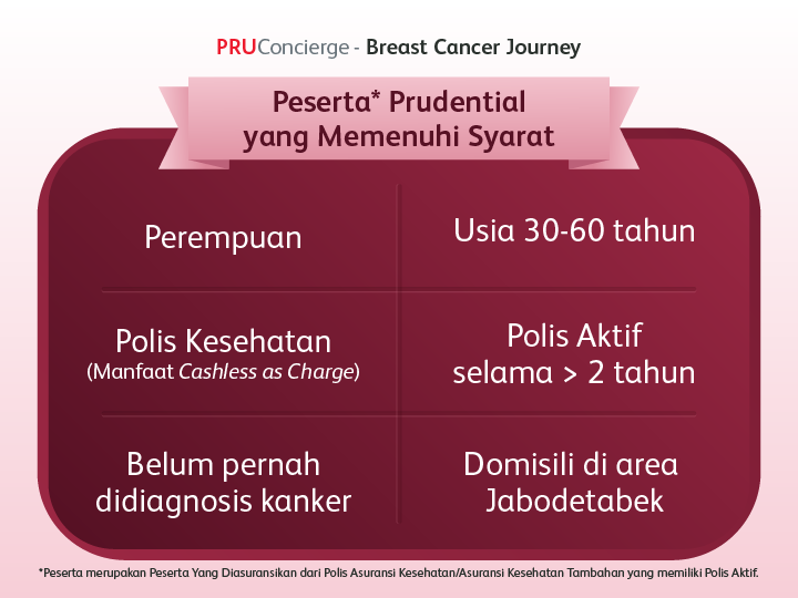 Peserta wanita existing Prudential Syariah berusia 30-60 tahun pada saat pendaftaran skrining kanker payudara atau diagnosa pertama kali atas kanker payudara, yang memiliki polis aktif manfaat cashless as-charged dengan plan apapun (PRUPrime Healthcare, PRUPrime Healthcare Syariah, PRUPrime Healthcare Plus, PRUPrime Healthcare Plus Syariah, PRUPrime Healthcare Plus Pro, PRUPrime Healthcare Plus Pro Syariah, PRUSolusi Sehat, PRUSolusi Sehat Syariah, PRUSolusi Sehat Plus Pro, PRUSolusi Sehat Plus Pro Syariah, PRUWell Health, PRUWell Health Syariah, PRUWell Medical, dan PRUWell Medical Syariah), telah melewati masa tunggu (waiting period) 24 bulan sejak tanggal penerbitan polis atau sejak perubahan manfaat polis terakhir, atau sejak pemulihan polis terakhir dan tidak memiliki riwayat klaim atau perawatan terkait kondisi kanker, serta berdomisili di wilayah Jabodetabek.