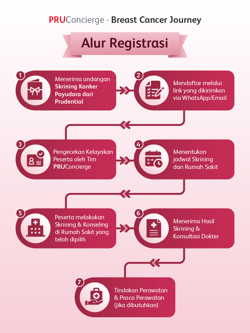 Kami akan memberikan menerapkan rate spesial/diskon skrining kanker payudara khusus di MRCCC Siloam Hospitals Semanggi dan Mandaya Royal Hospital Puri untuk Peserta terpilih yang kehabisan kuota layanan. Informasi lebih lanjut akan diberikan melalui WhatsApp PRUConcierge di nomor 081190000868.