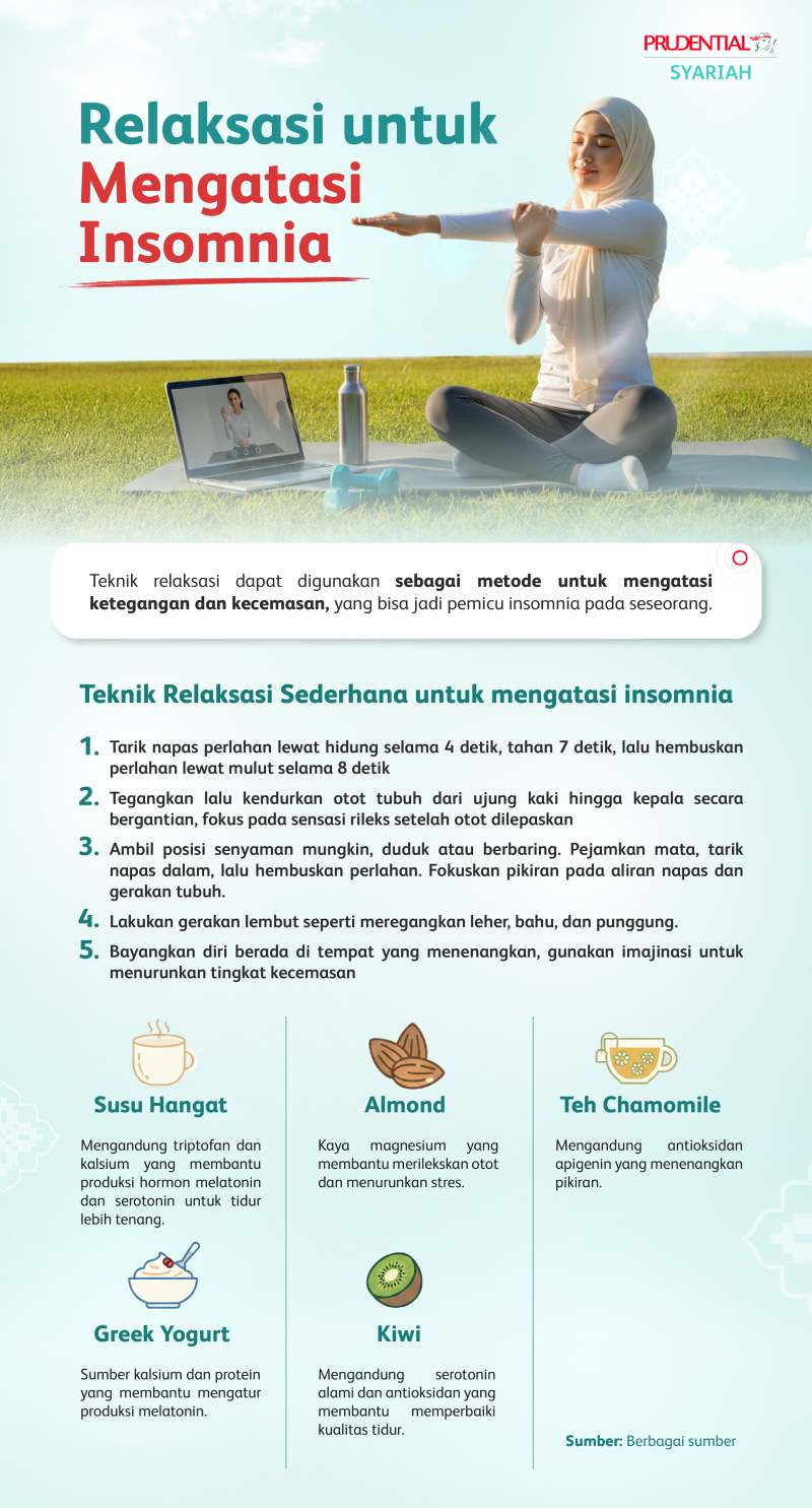 Batasi gawai dan kafein malam hari, buat kamar gelap/tenang, dan lakukan relaksasi sebelum tidur.
